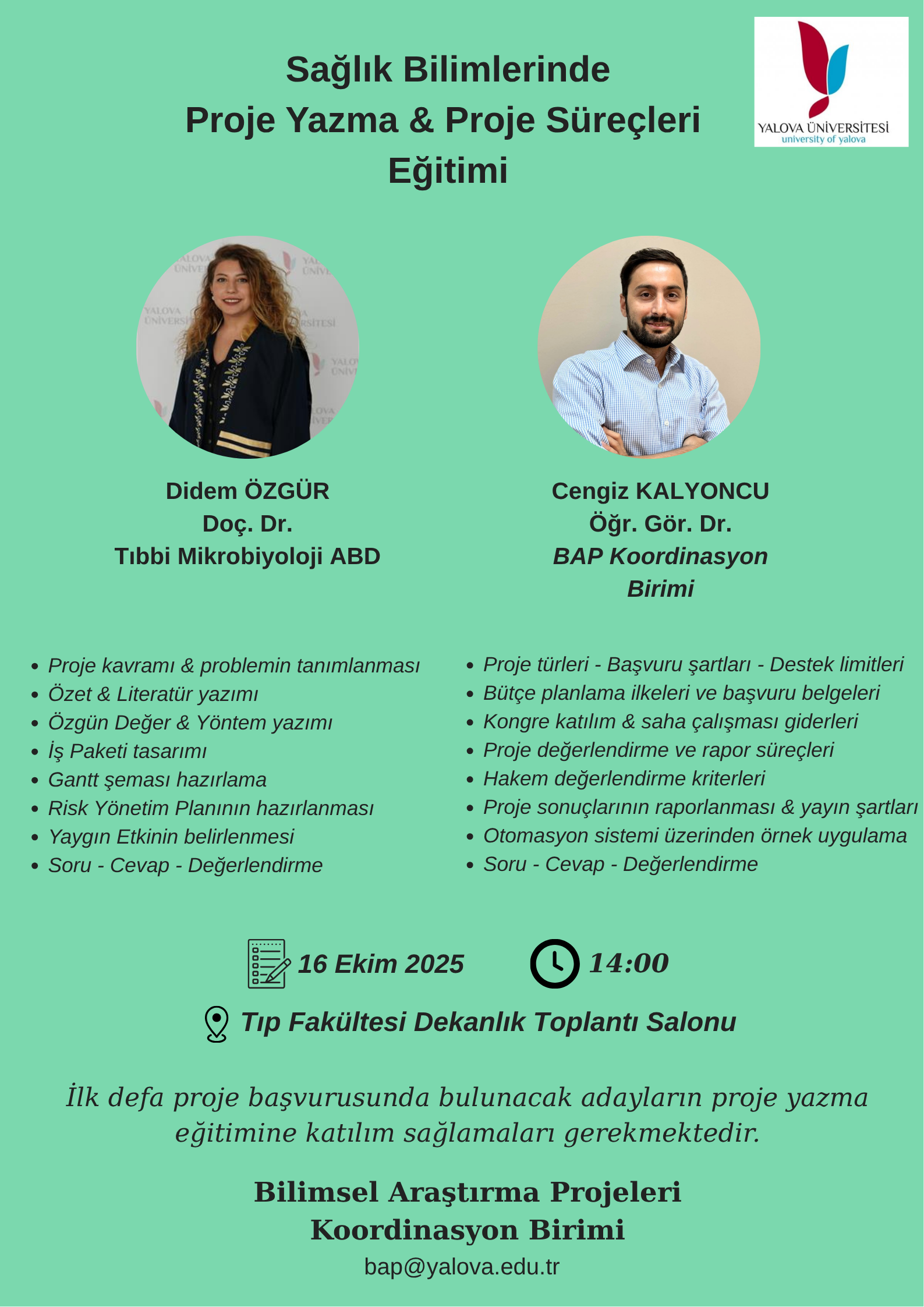 Sağlık Bilimleri alanında proje başvurusunda bulunacak proje yürütücüsü adaylarımız için “Sağlık Bilimlerinde Proje Yazma & Proje Süreçleri Eğitimi” verilecektir. İlk defa proje başvurusunda bulunacak adayların (Lisansüstü tez projesi hariç) proje yazma eğitimine katılım sağlamaları zorunludur. Tüm araştırmacılarımıza saygıyla duyurulur.
